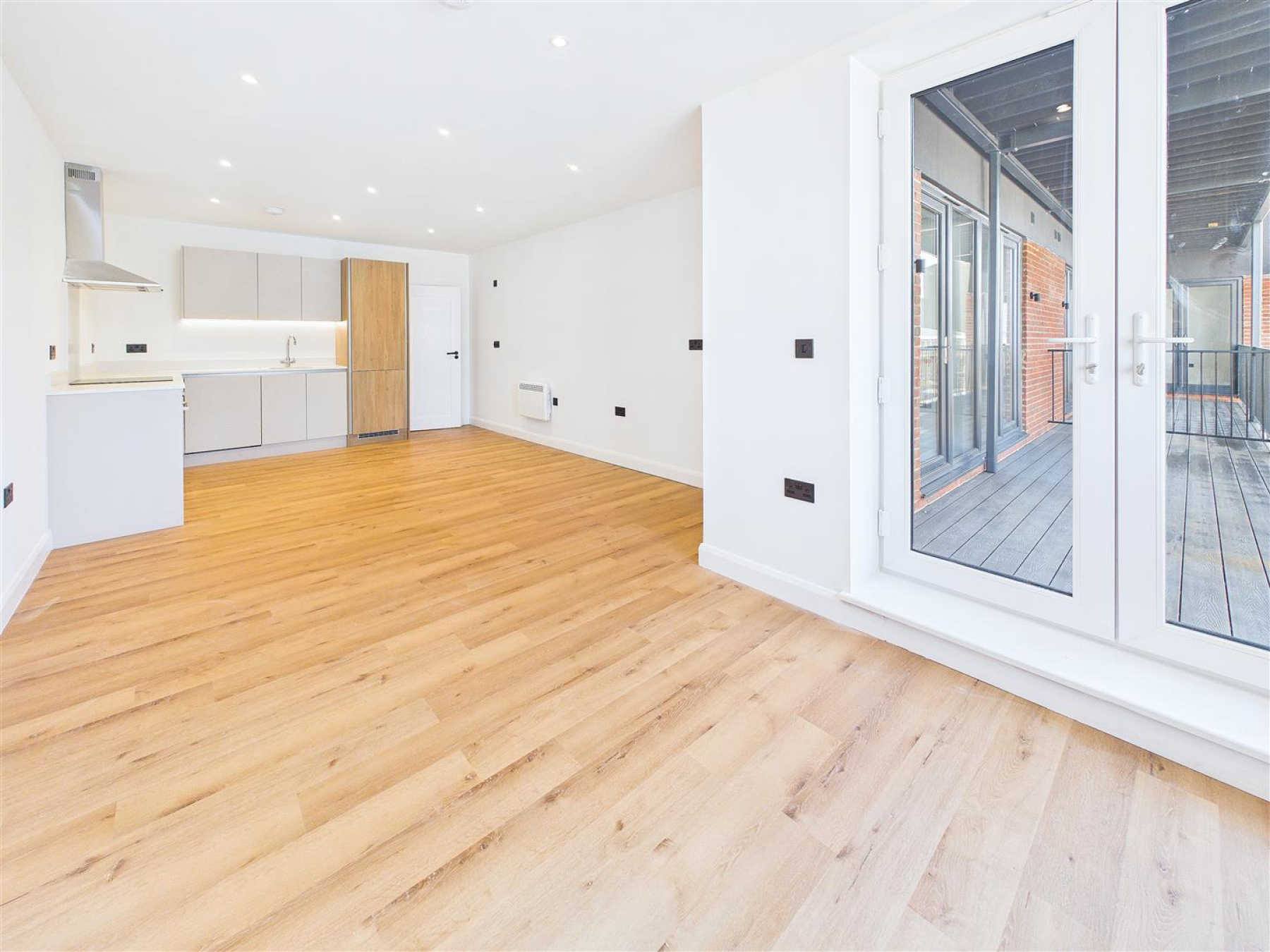 Open Plan Kitchen/Living Room - This open plan kitchen is complete with an integrated fridge/freezer, dishwasher and electric 'Bosch' oven and an induction hob with stone work surfaces. Doors to balcony.