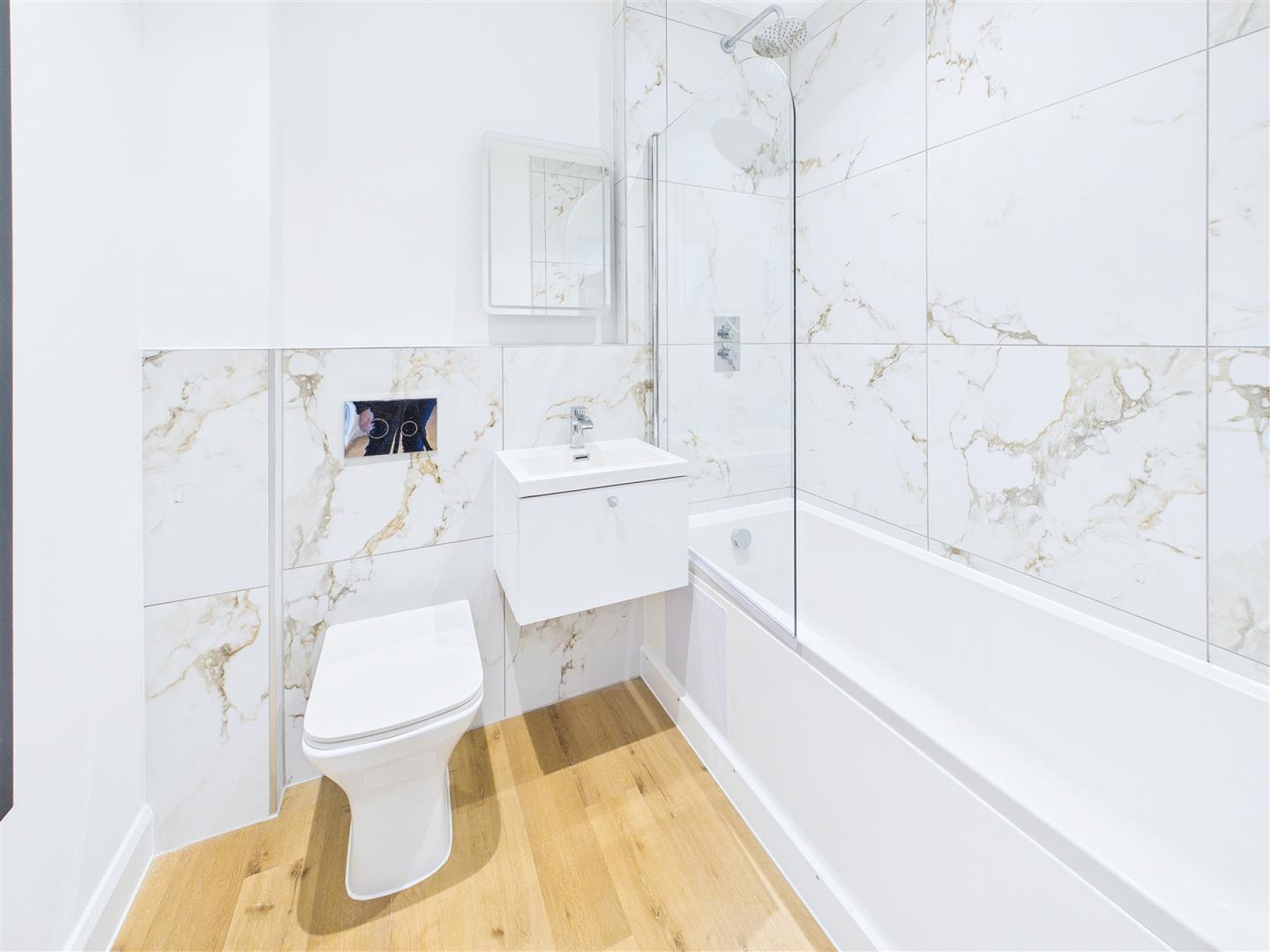 Bathroom - A luxurious bathroom suite comprising a bath with a shower over, wash hand basin and WC, fully tiled.