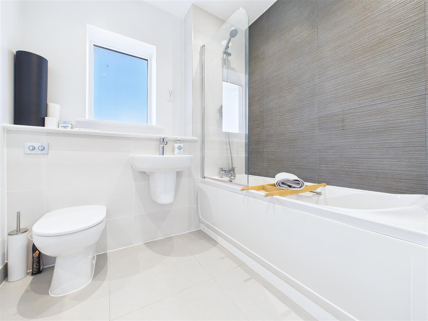 Bathroom - 2.18m x 1.91m (7'2 x 6'3) - Panelled bath with shower over. pedestal wash hand basin, close coupled WC. Underfloor heating, window to rear.