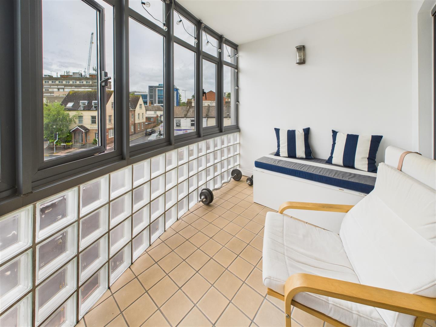 Sunroom - 3.25m x 2.21m (10'8 x 7'3) - Enclosed area with windows and glass blocks to the front. Door to Balcony