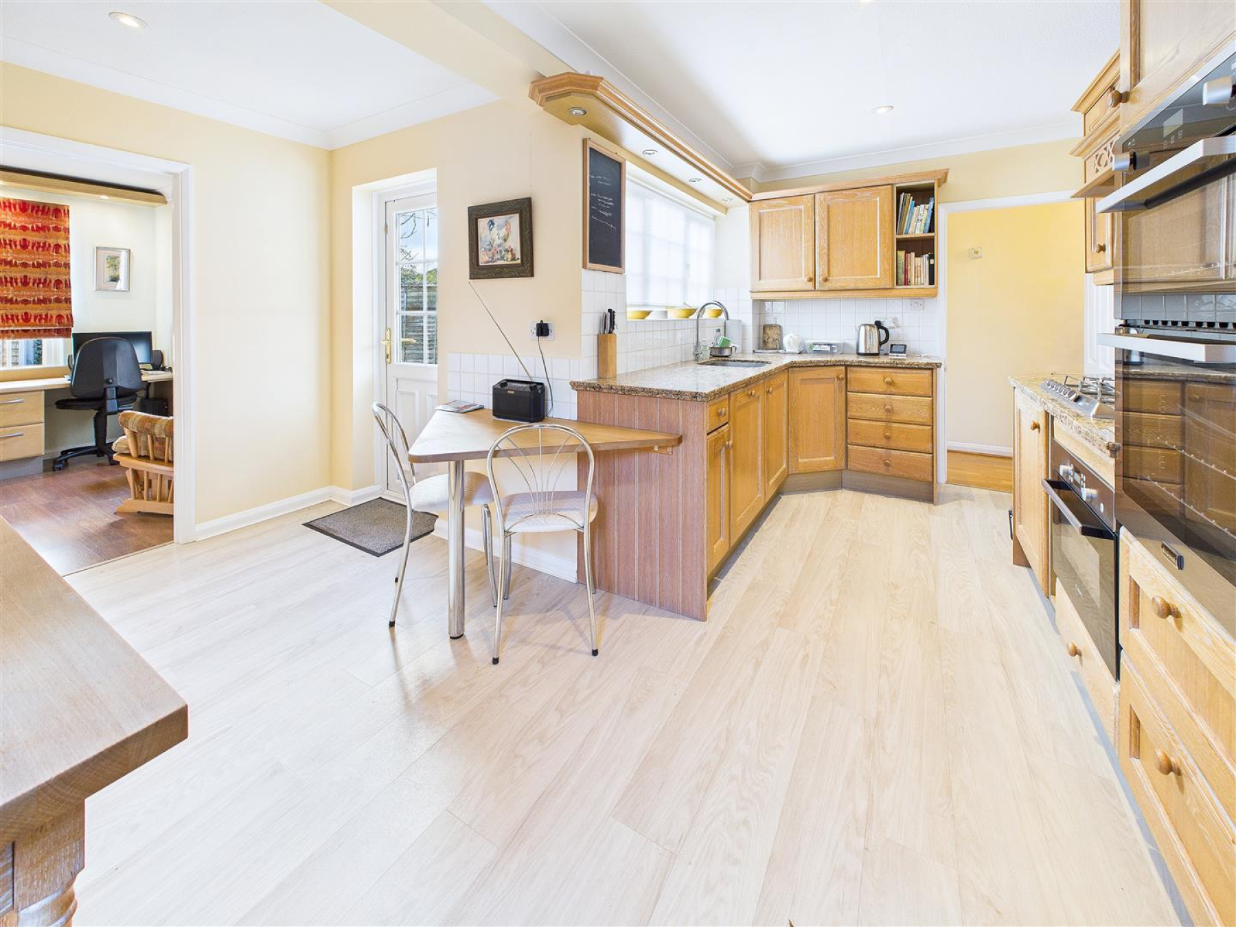 L- Shaped Kitchen Breakfast Room - 2.29m x 2.31m into 2.31m x 4.34m (7'6 x 7'7 into 7 - Window to rear, door the side and door to rear. Range of fitted storage units. Integrated fridge, freezer, electric oven, microwave and dishwasher. Granite work surfaces incorporate sink unit with mixer tap along with gas hob with extractor fan over. Breakfast bar. Part tiled walls.