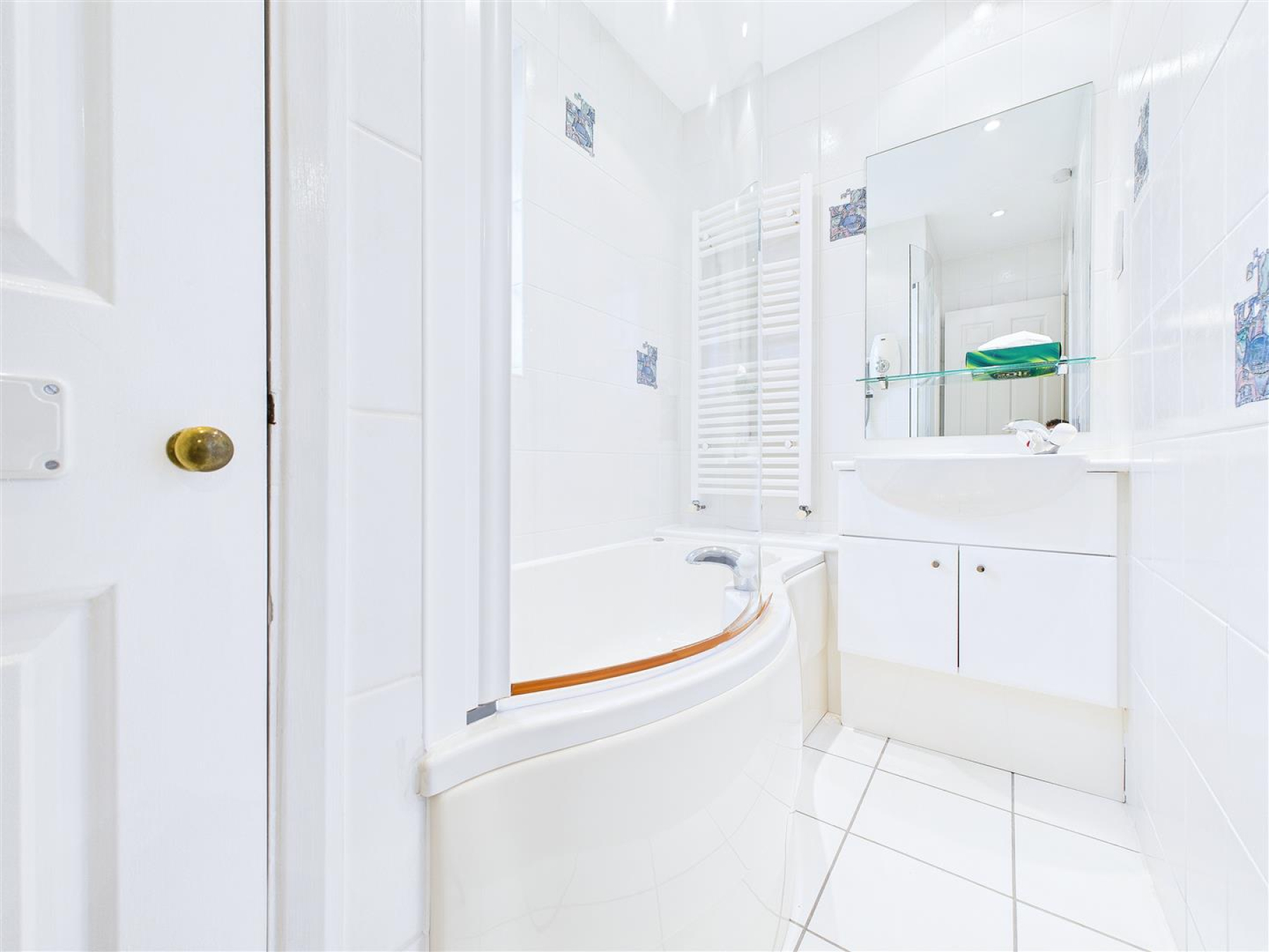 Ensuite - 2.39m x 2.13m (7'10 x 7') - Window to rear, shower cubicle, 'Jacuzzi' bath, close coupled WC, vanity wash hand basin, heated towel rail, tiled walls.