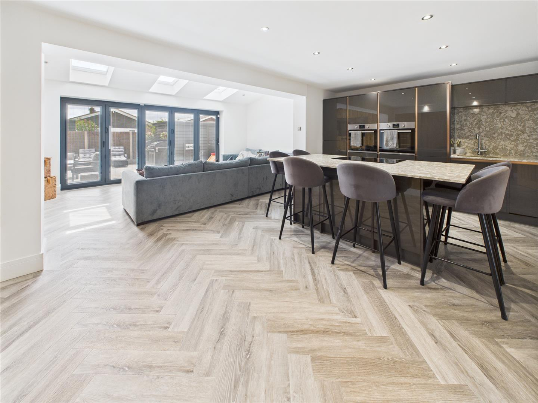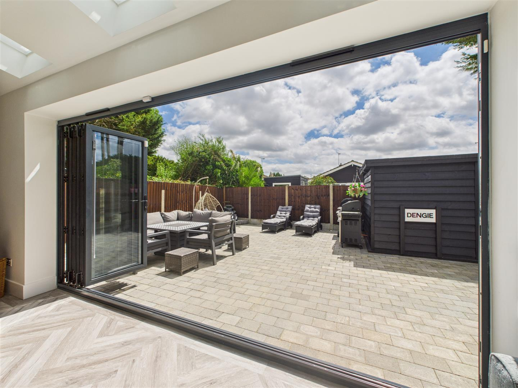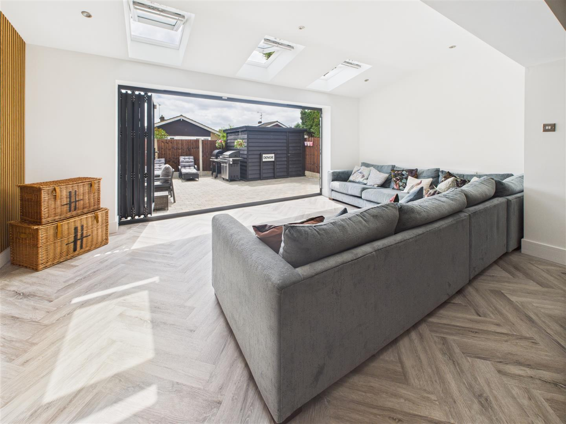 Living Room - By-Folding doors to the rear garden with electric 'Velux' windows. Feature wall with space the entertainment system.