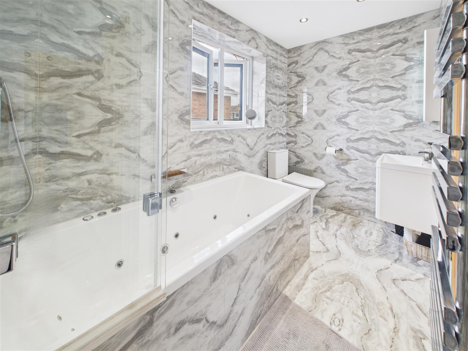 Family Bathroom - A luxurious bathroom suite comprising a Jacuzzi bath with shower over, close coupled WC, wash hand basin, heated towel rail. Doors to Bedroom One and Landing.