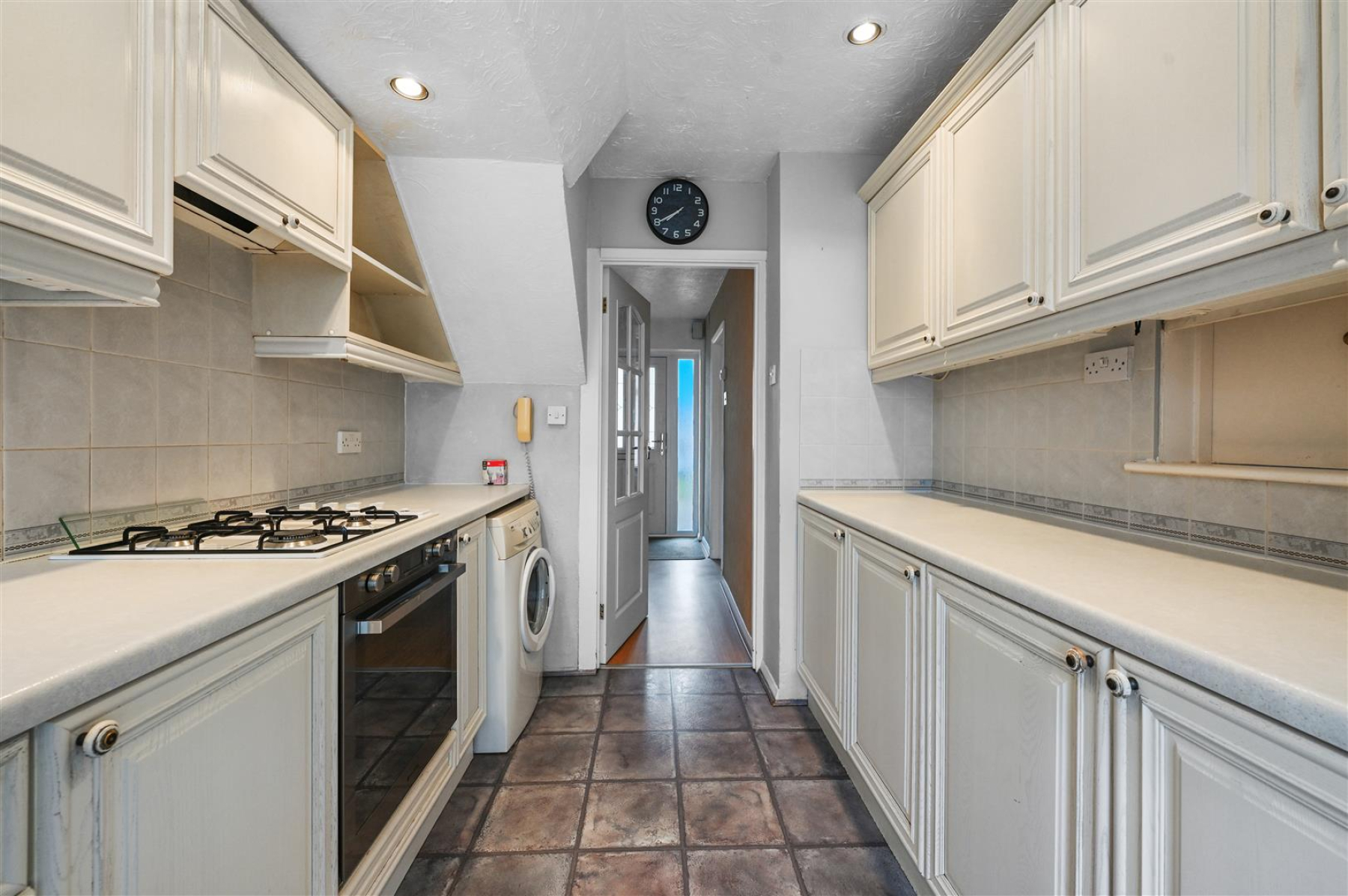 Kitchen - 3.40m x 2.36m (11'2 x 7'9) - Window and door to rear, range of fitted units with an integrated electric oven. Space and plumbing for washing machine and fridge/freezer. Work surfaces incorporate sink unit and gas hob with extractor over.