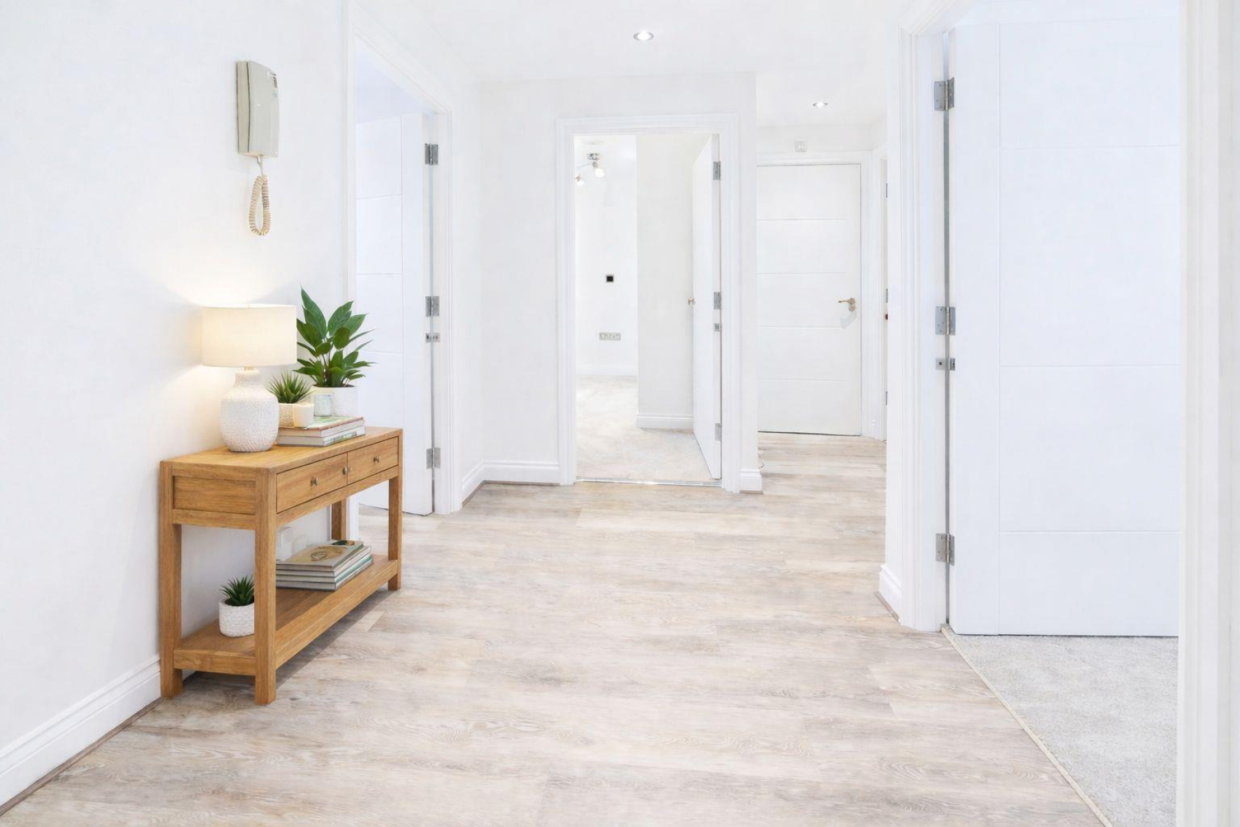 Entrance Hall - 3.30m x 1.85m (10'10 x 6'1) - Entrance door, storage cupboard, Wood effect flooring, further storage cupboard housing new Vailliant combi boiler.