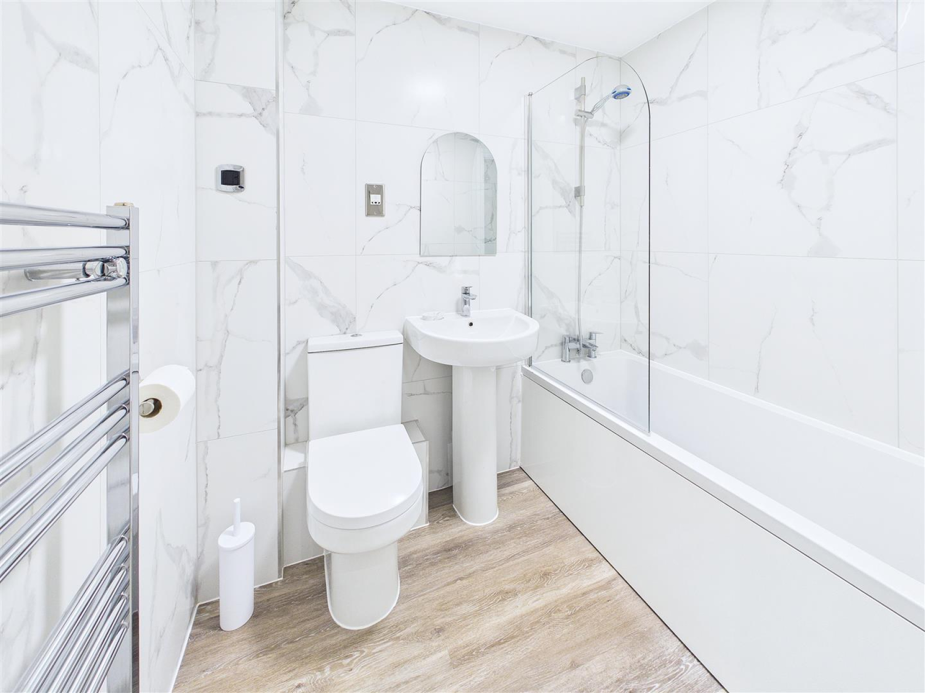 Re-Fitted Bathroom - 2.06m x 1.65m (6'9 x 5'5) - Panelled bath with shower over, close coupled WC, wash hand basin, heated towel rail.