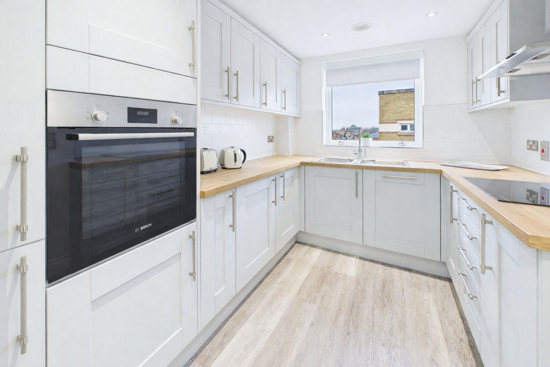Re-Fitted Kitchen - 3.20m x 2.49m (10'6 x 8'2) - Window to front. Range of fitted storage cupboards with integrated electric oven, fridge/freezer, dishwasher and washing machine. The work surfaces incorporate the sink unit and h=gas hob with extractor hood over.