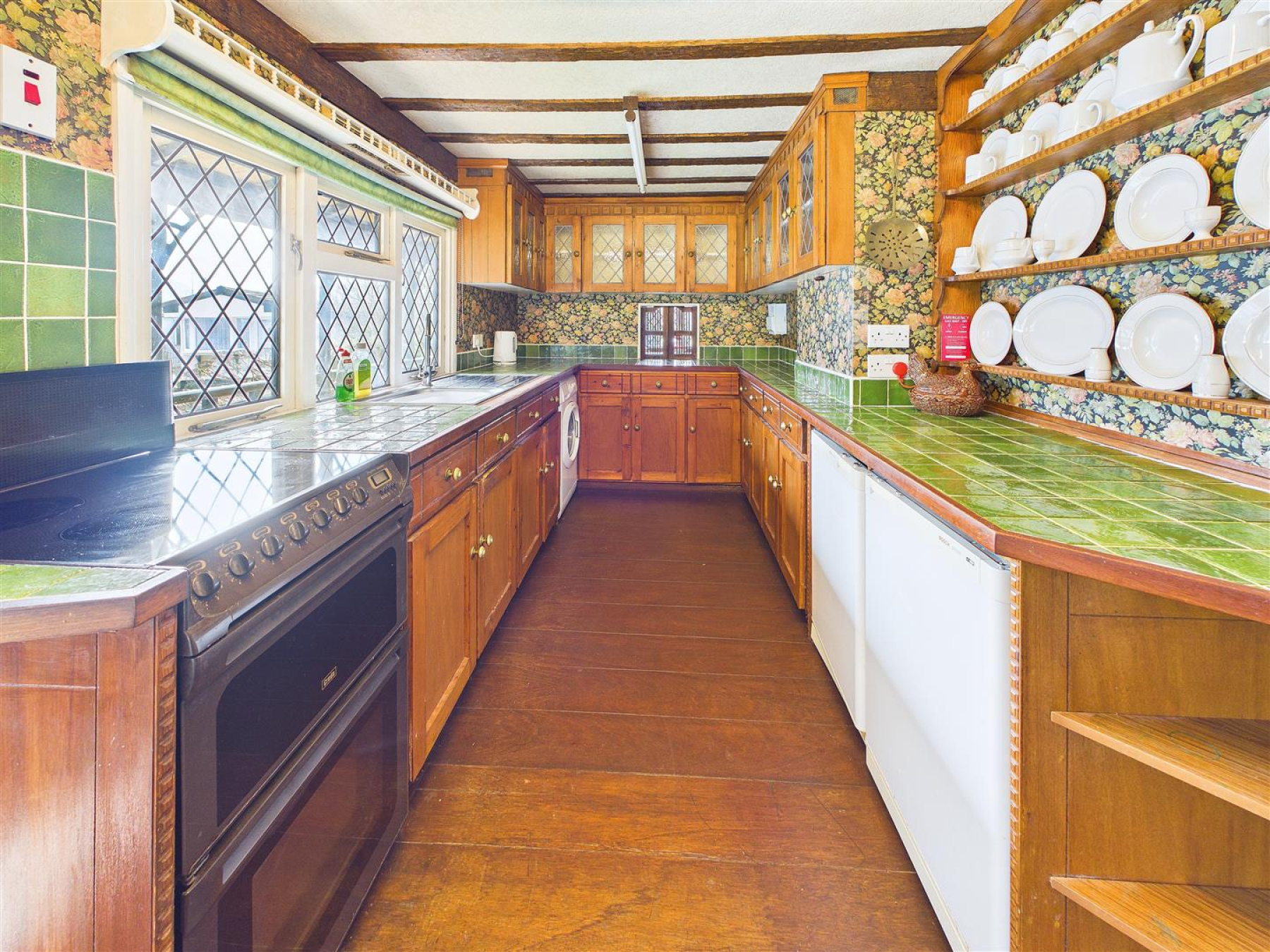 Kitchen - 4.62m x 2.16m (15'2 x 7'1) - Window and door to side. Range of fitted storage cupboards. Space and plumbing for oven, fridge, freezer and washing machine. Tiled work surfaces incorporating sink unit.