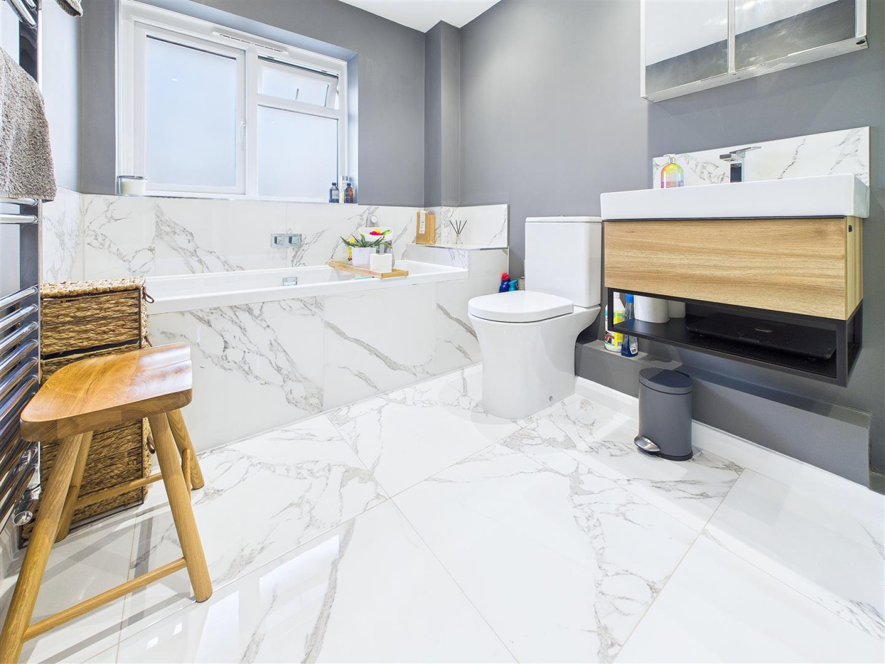 Bathroom - 3.12m x 2.08m (10'3 x 6'10) - Window to rear, tiled bath, close coupled WC, shower cubicle, vanity wash hand basin, heated towel rail.