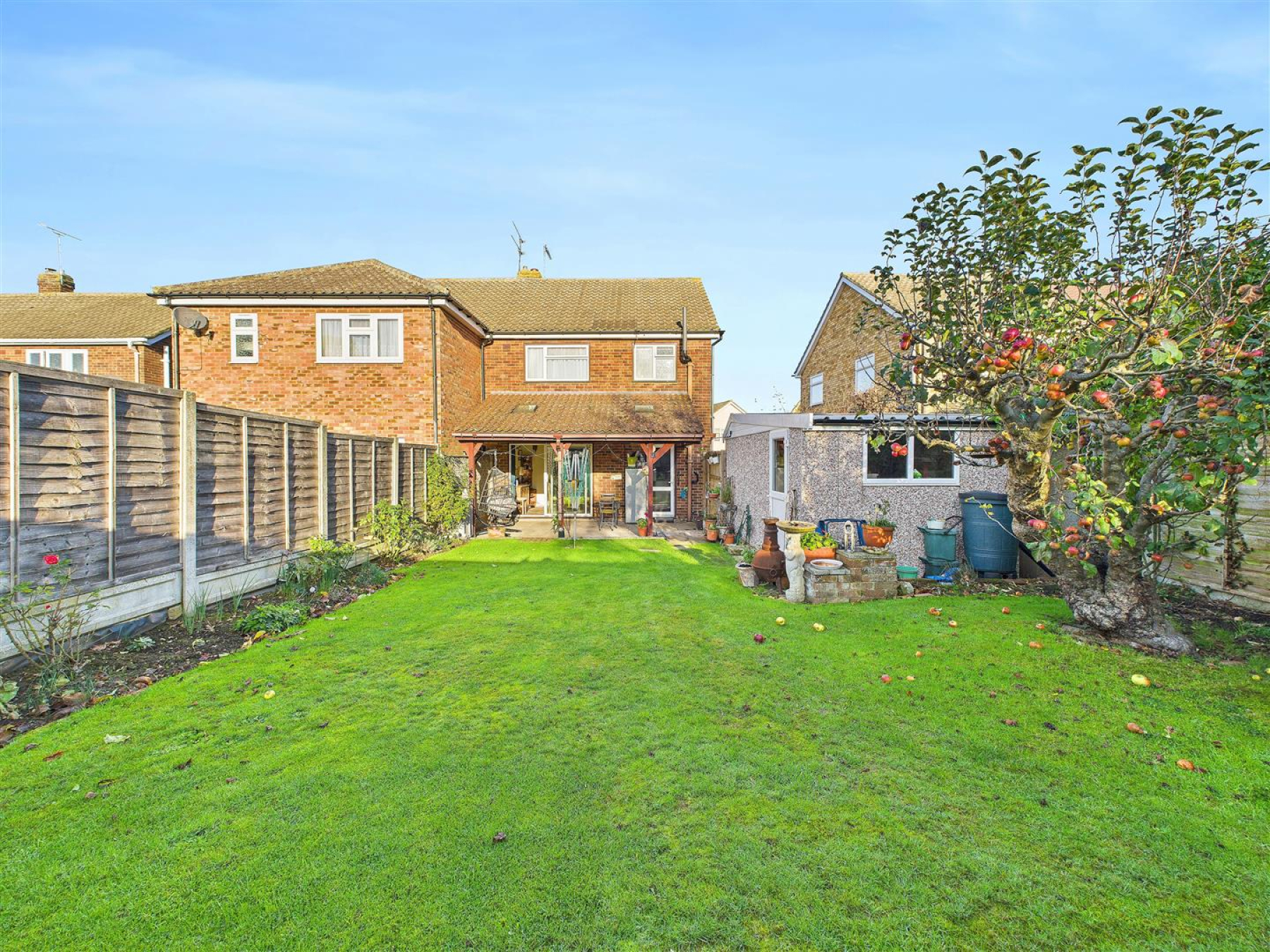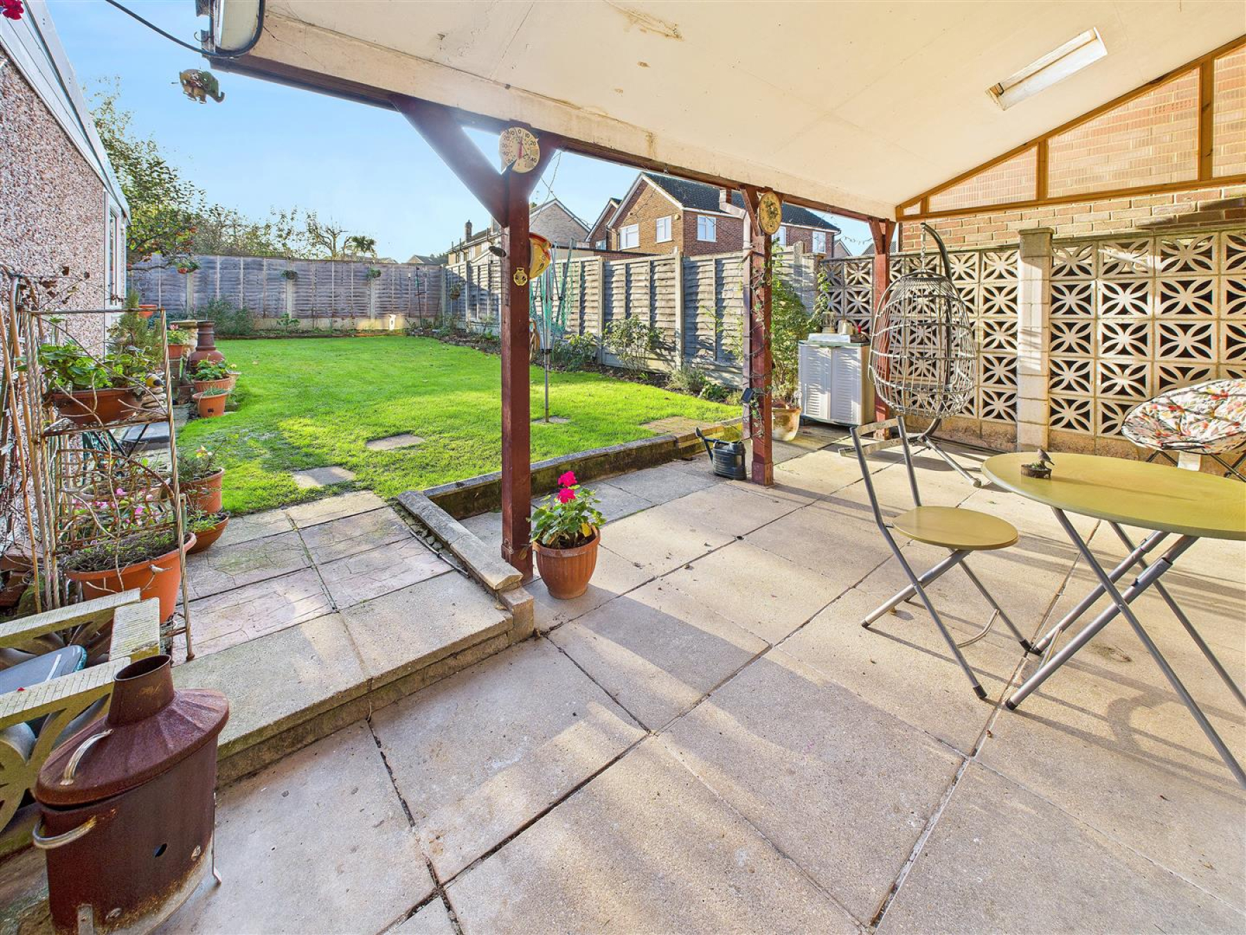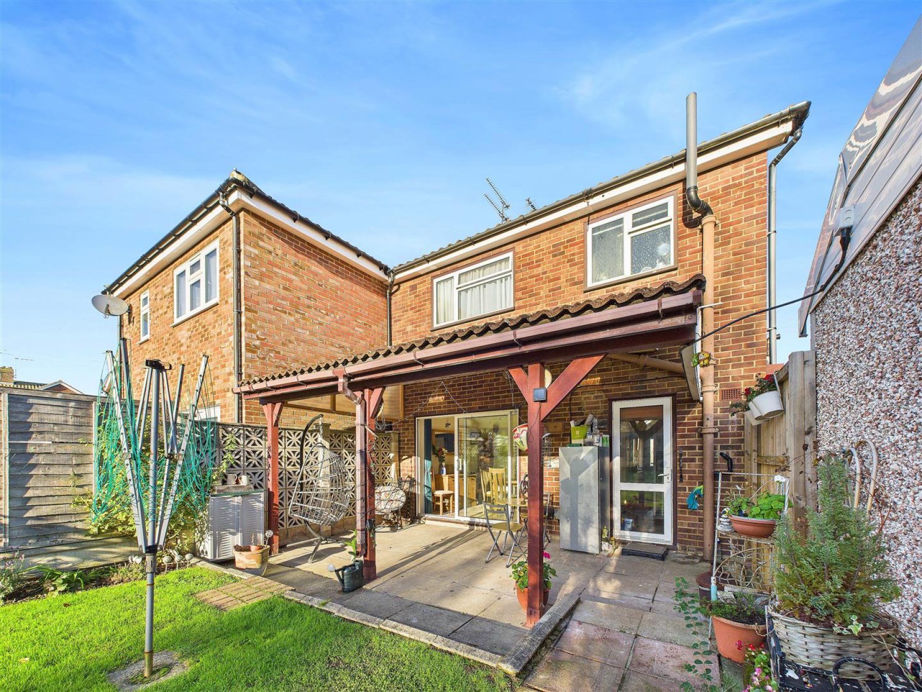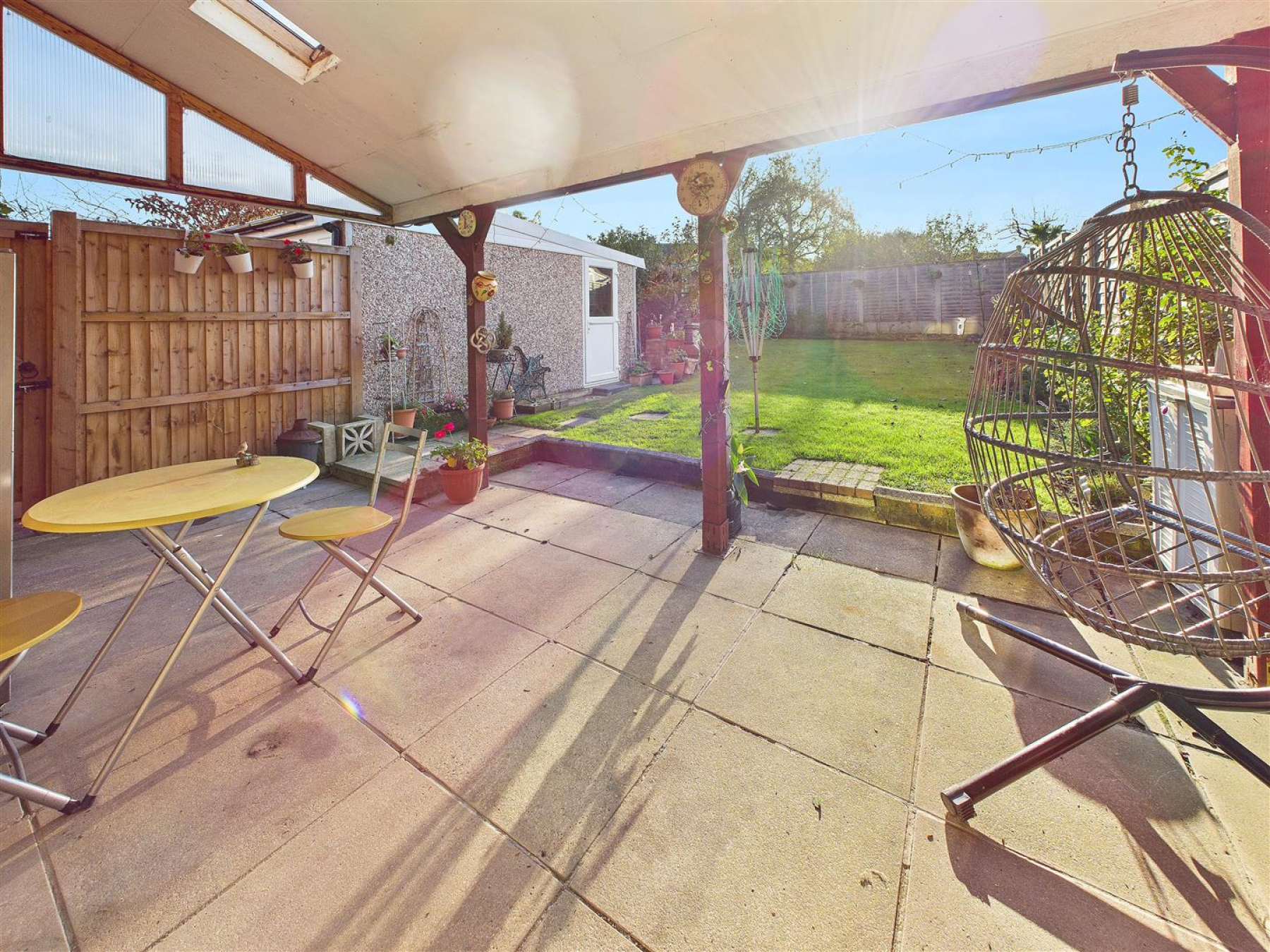 Rear Garden - Covered paved seating area, remainder laid to lawn with fencing to boundaries, access to front.