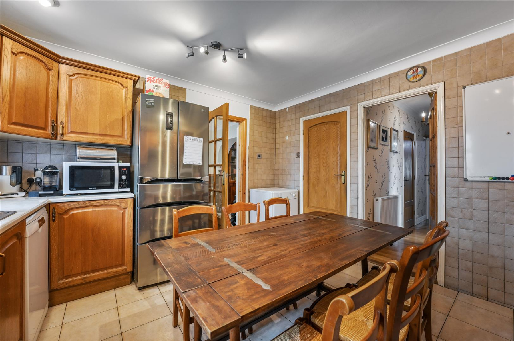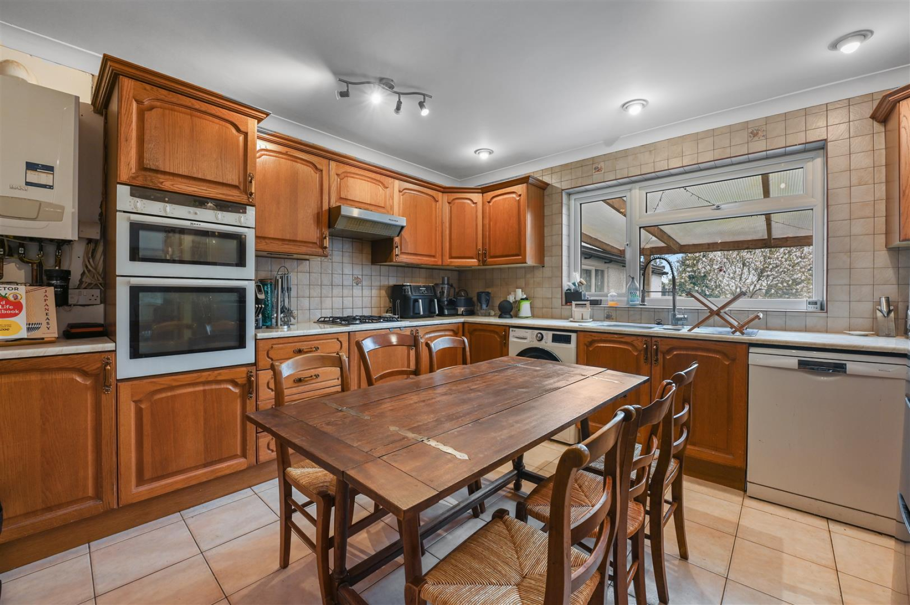 Kitchen/Breakfast Room - 3.91m x 3.63m (12'10 x 11'11) - Window to rear. Range of fitted storage units. Integrated electric oven. Space and plumbing for washing machine, dishwasher and fridge/freezer. Wall mounted boiler. Work surfaces incorporate sink unit and gas hob with extractor hood over. Part tiled walls. Large storage cupboard/larder.