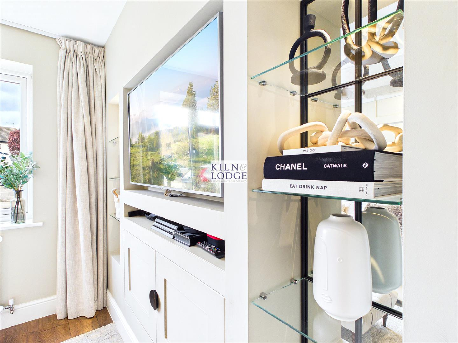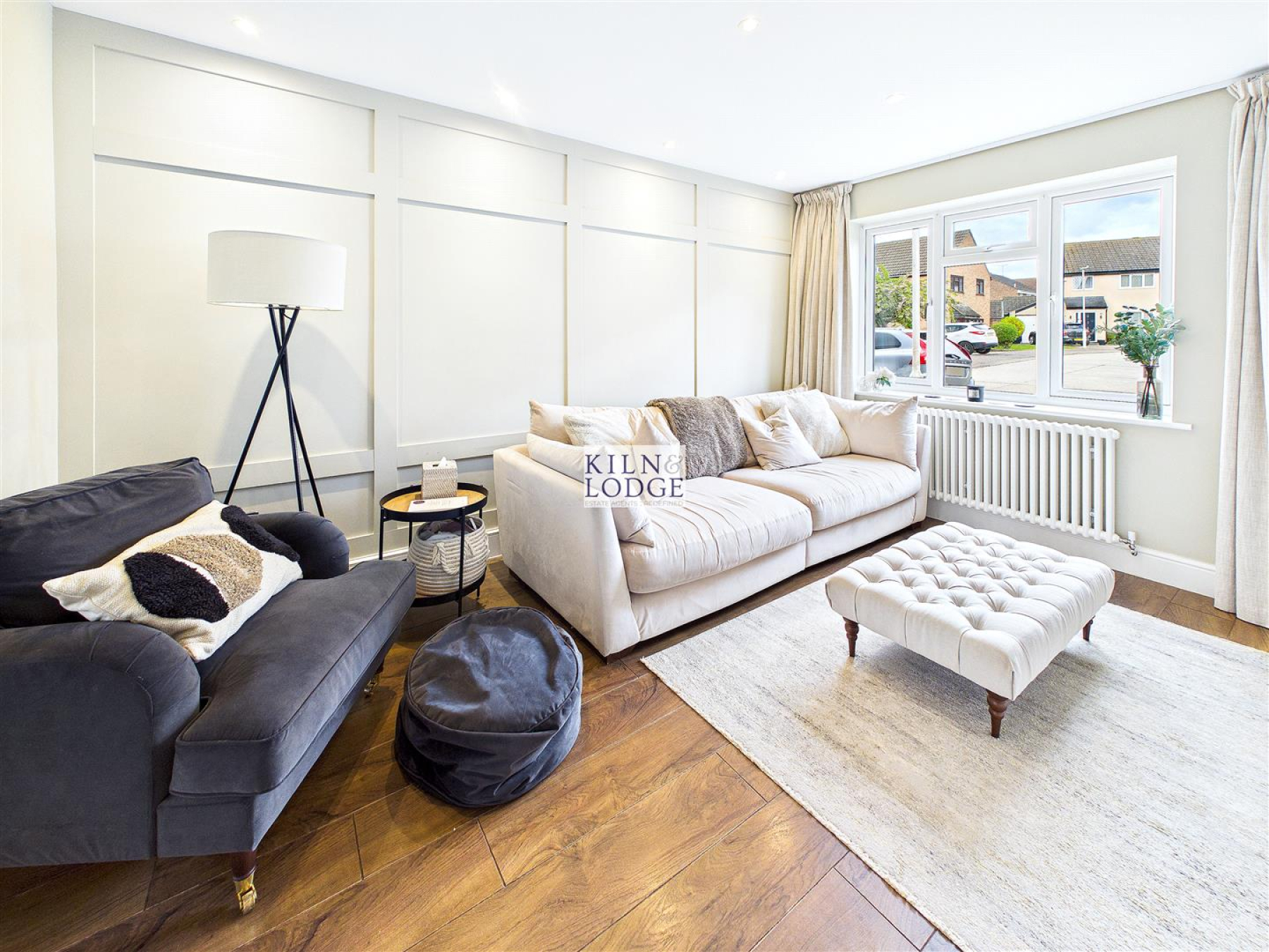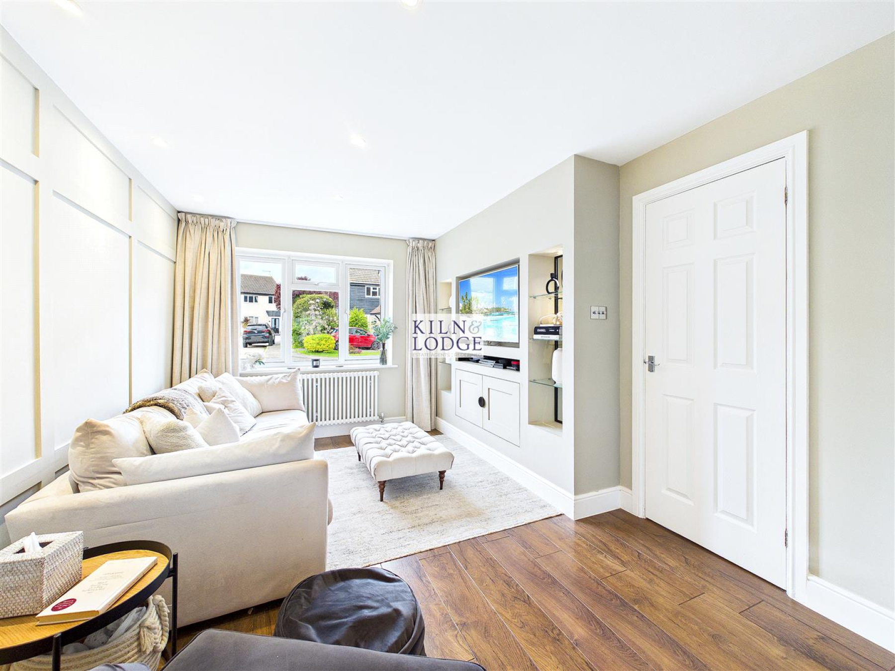 Living Room - 3.96m'2.74m x 3.05m'0.91m (13'9 x 10'3) - Window to front, media wall, radiator, wood panelling.