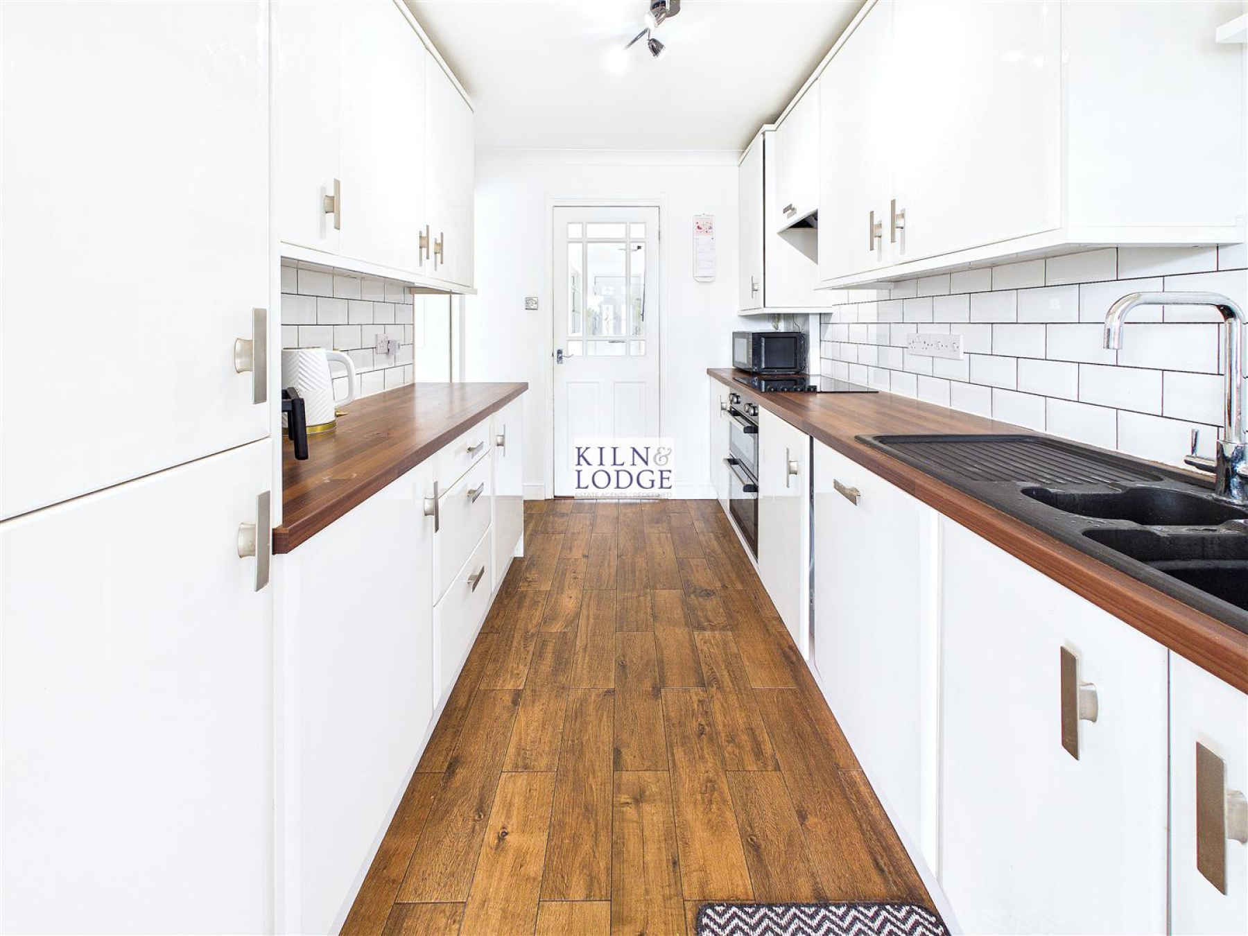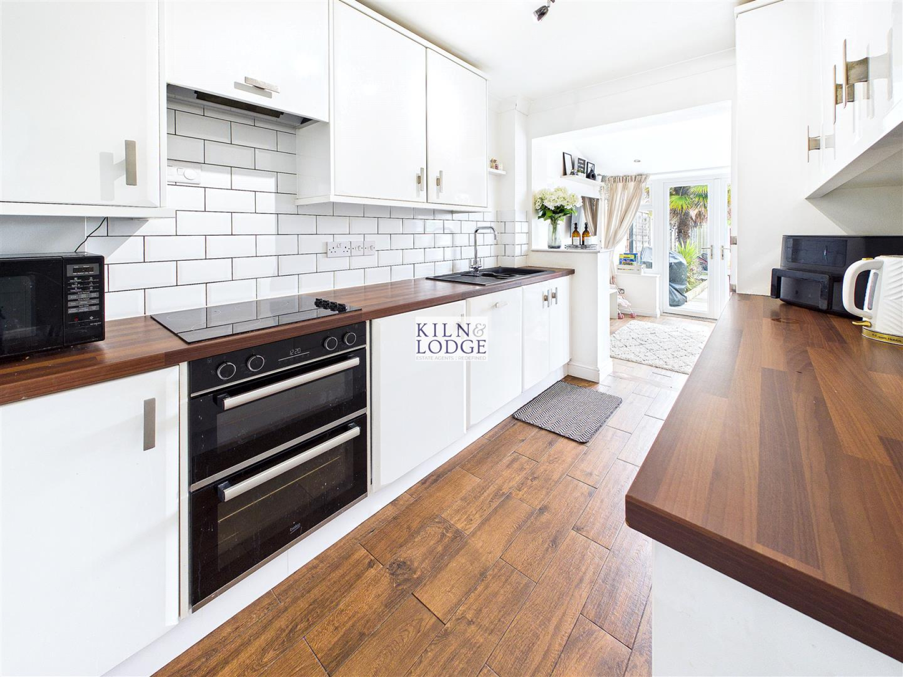 Kitchen - 3.05m'3.05m x 2.13m'1.83m (10'10 x 7'6) - Range of fitted storage cupboards with an integrated electric oven, fridge/freezer and dishwasher. The work surfaces incorporate the sink unit with mixer taps, induction hob with extractor fan over, part tiled walls. Open to:
