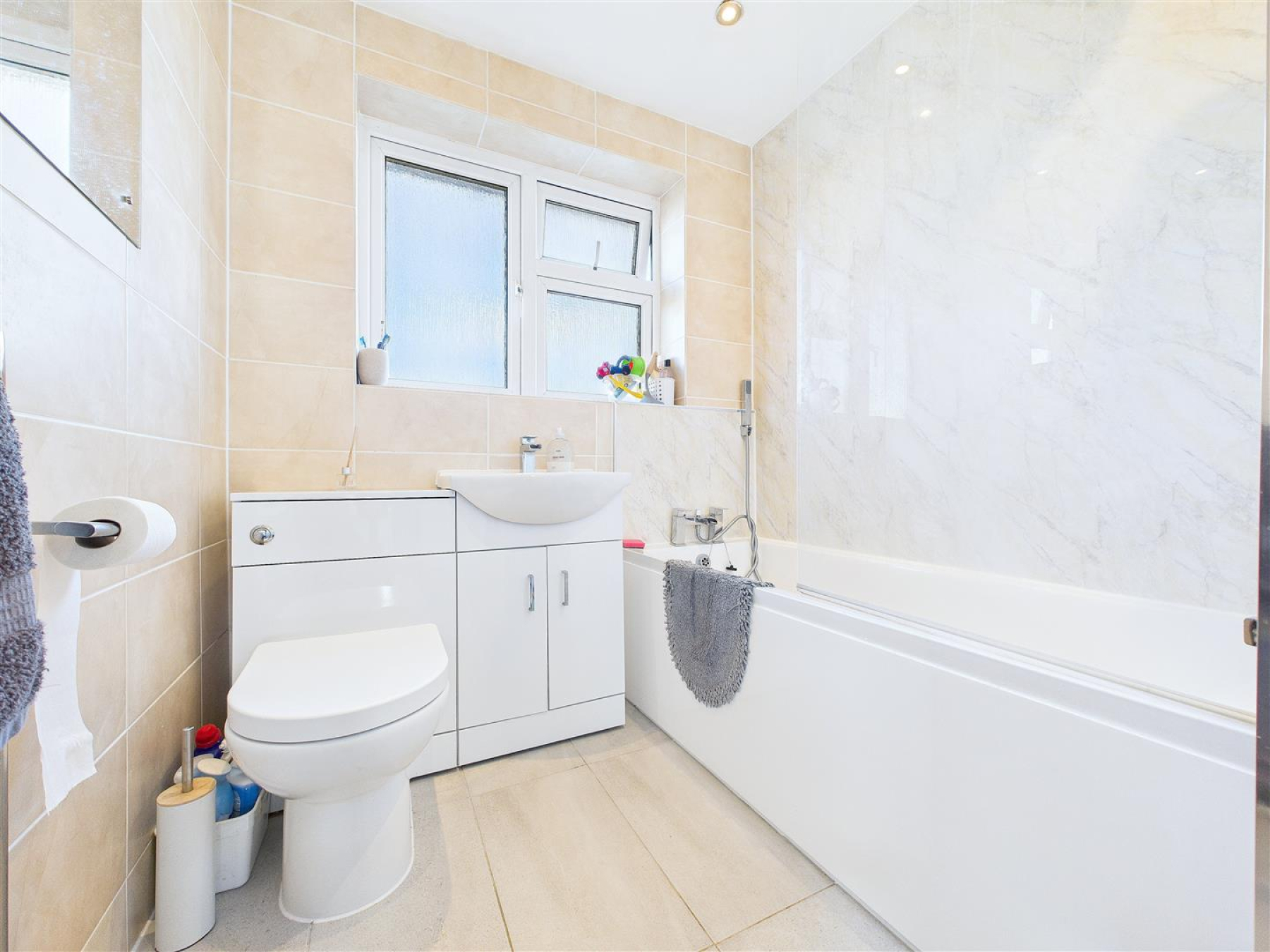 Bathroom - 1.91m x 1.68m (6'3 x 5'6) - Obscure double glazed window to rear. Three piece modern white suite comprising low level WC, vanity wash hand basin and panelled bath with screen and shower attachments. Chrome effect heated towel rail. Fully tiled walls and flooring. Cupboard.