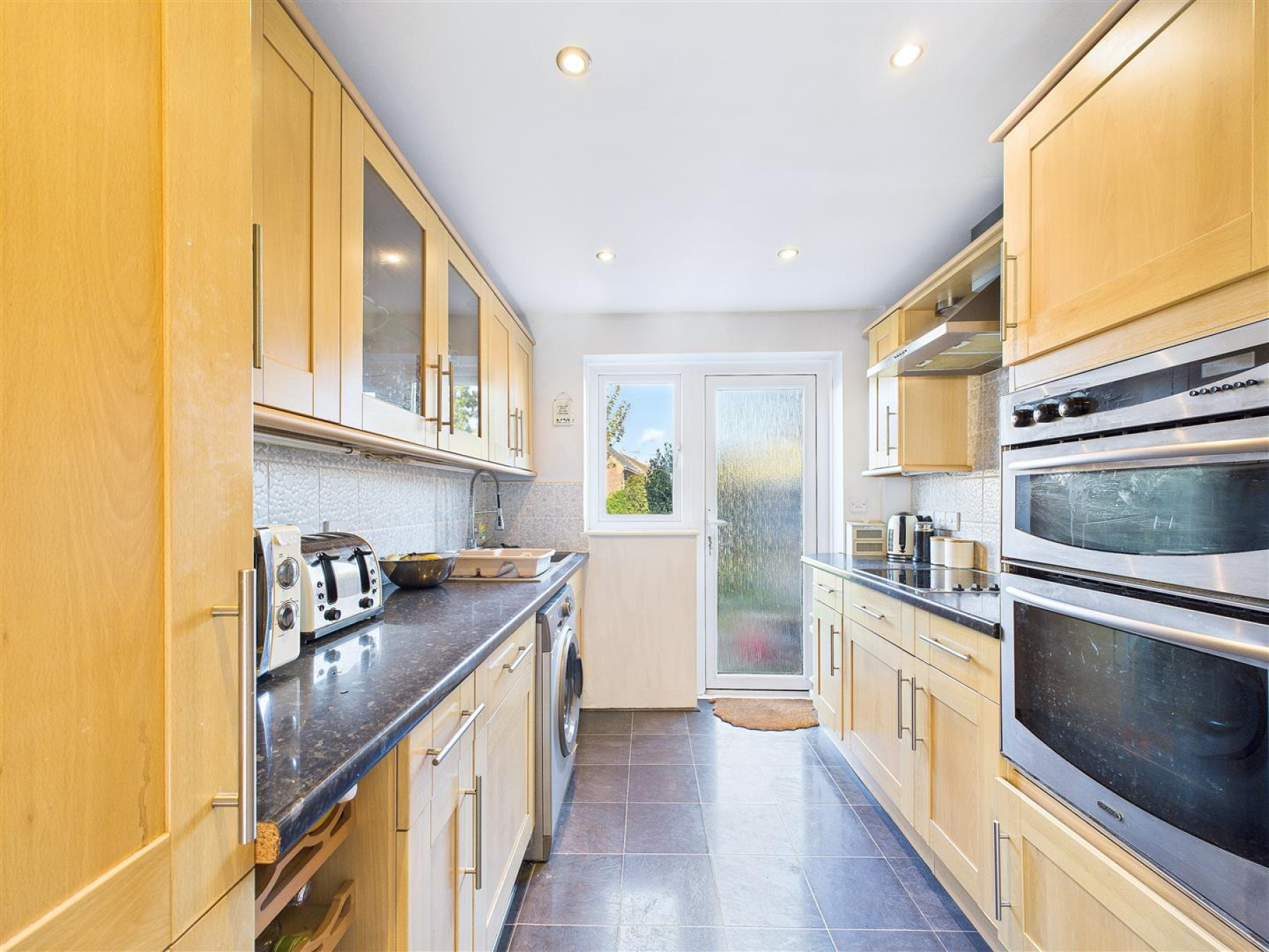 Kitchen - 3.15m x 2.41m (10'4 x 7'11) - Units to eye and base level. Electric hob with extractor fan over. Double oven. Space and plumbing for washing machine and fridge/freezer. Laminate work surfaces. Tiled flooring. Double glazed window to rear and door to rear garden.