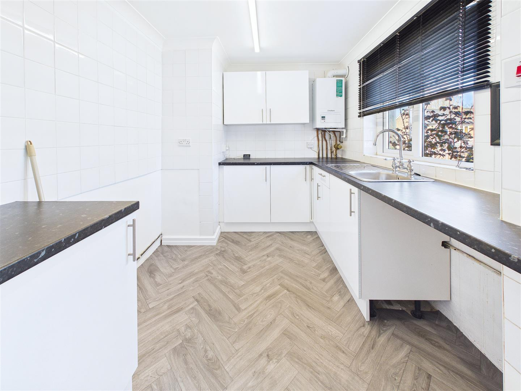 Entrance/Kitchen - 4.75m x 2.44m (15'7 x 8') - Entrance door, window to front. Range of fitted storage cupboards with space and plumbing for washing machine, fridge/freezer and oven. Wall mounted boiler, part tiled walls.